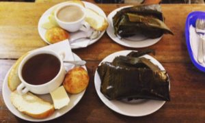 Estuve almorzando en La Puerta Falsa apenas un mes antes de ese 200 aniversario con mi prima Cristina, y me comí un típico tamal santafereño, con agua de panela, mi prima con chocolate, y queso con almojabana. Le tomé foto a la gruta de la Virgen antes de conocer bien la historia que les acabo de contar. Nos sentamos arriba, donde es más acogedor y se escapa uno un ratito del frío de la calle, y donde ahora al pagar se escuchan clientes dando las gracias en cualquier idioma, porque aunque La Puerta Falsa está lejos de ser un “tourist trap”, sus visitantes hoy en día vienen de todas partes del mundo. Ya tengo ganas de volver a sentarme a “echar carreta” con mi prima un rato en esas mesitas de madera.