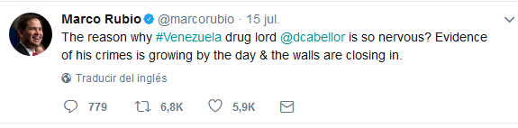 Los senadores informados en las últimas semanas sobre las medidas relacionadas con Venezuela incluyen a Marco Rubio, así como a Bob Corker de Tennessee, según dos personas familiarizadas con las discusiones. Los funcionarios presentaron un expediente, de más de 200 páginas, que incluía denuncias de delitos de cuello blanco relacionados con PDVSA, dijeron tres de las personas. Los portavoces de Rubio y Corker no respondieron a las solicitudes de comentarios. Rubio, el 14 de julio, publicó en Twitter que Cabello se sentía «nervioso» en reacción al hecho de que «la evidencia de sus crímenes está creciendo con los días», mientras «las paredes se le están cerrando».