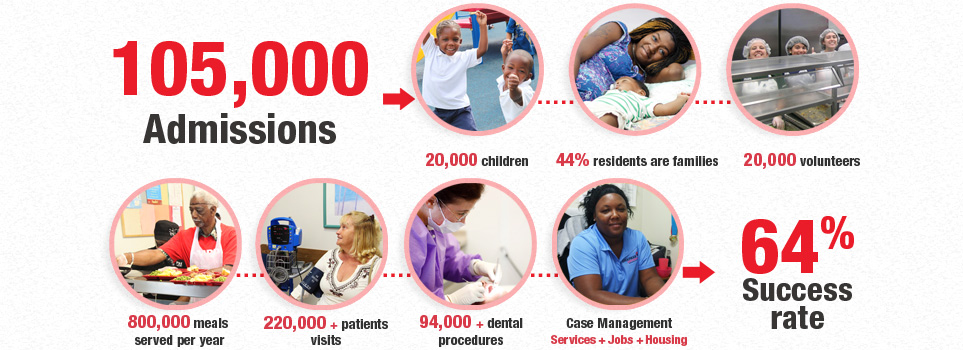 Estos dos centros están dotados de clínicas médicas y dentales totalmente equipadas, dormitorios familiares, comedores, salas de conferencias, cafeterías, aulas, Wi-Fi, guarderías, una cancha de baloncesto e incluso un lugar para las mascotas y cuenta con personal calificado que brinda apoyo integral para estas personas que incluye asistencia médica, dental y psiquiátrica, cuidado de día, entrenamiento para trabajo y colocación de empleo y asistencia para asegurar una vivienda estable porque es bien sabido que cuando una persona se queda sin hogar, afecta cada aspecto de su vida, se siente indefensa y sin esperanza y el impacto va mucho más allá de su salud y autoestima, afectando su capacidad de proveer para su familia y su futuro. La duración media de la estancia para los adultos solteros es de 89 días y las familias con niños de 133 días.