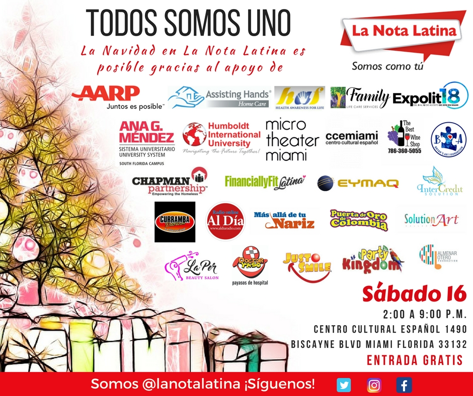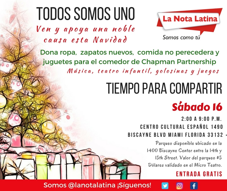 El próximo sábado 16 de diciembre, La Nota Latina y sus amigos realizarán un evento artístico y musical, completamente gratis, en las instalaciones del Centro Cultural Español, ubicado en la 1490 Biscayne Boulevard de Miami, de dos de la tarde a nueve de la noche, con el propósito de recolectar alimentos no perecederos, ropa, zapatos y juguetes que serán entregados a la Fundación Chapman Partnership que trabaja con niños, mujeres y hombres sin hogar de Homestead y del Dowtown de Miami.