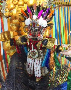 Uno de sus organizadores, el Sr. Yanco Souffront, me explicó el significado del traje típico del festival, y, además, me dejó probarme uno de los vistosos adornos para la cabeza. Creo que es mejor que le dejen la corona a Gabriela. El Traje Taimáscano representa lo siguiente: desde la cintura a los pies, con las conchas de mar, representa al Dios del Mar, Neptuno, sirenos hijos del dios del Mar, testigo de realidades y aventuras del Mar del Atlántico. La camisa de corte colonizador, con pañoletas en las mangas de diversos colores, representan el vudú africano, diferentes divinidades, luces que forman parte de la identidad individual de cada participante; esto es parte de la cultura afroantillana del Caribe. El manto o capa principesca que cubre la ingenuidad del cuerpo para mantener la pureza de nuestros orígenes se decora con los trazos de la pictografía taína y es un legado que dejaron nuestros antepasados a aborígenes en cuevas y hallazgos. El rostro se cubre con una máscara representando esfinges taínas cemíes o algunas vasijas de barro.
