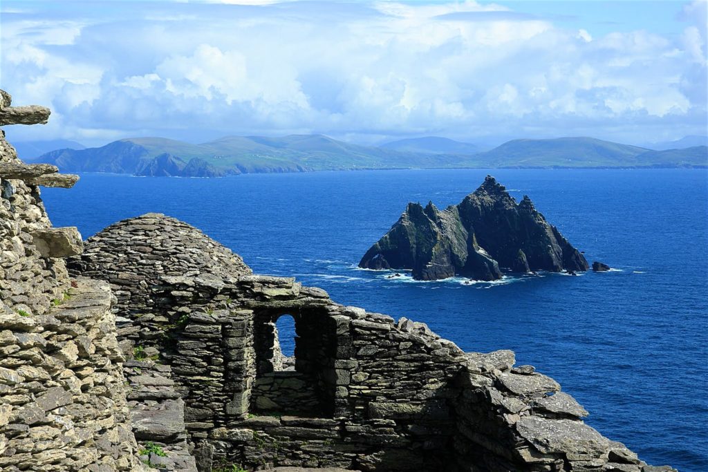 La isla alberga un monasterio hecho de cabañas de piedra en forma de colmena (llamadas clochain) del siglo VI, que se encuentran sobre un acantilado de 200 metros. La única forma de llegar a las ruinas del monasterio es subir unas escaleras de granito de 600 escalones, construidas por los mismos monjes. Las vistas merecen el esfuerzo.